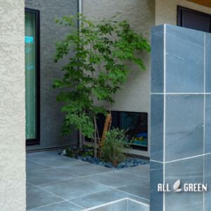角に施工された植栽スペースは、邸宅内部の窓からもしっかり植物をお楽しみただける坪庭として活躍しています。