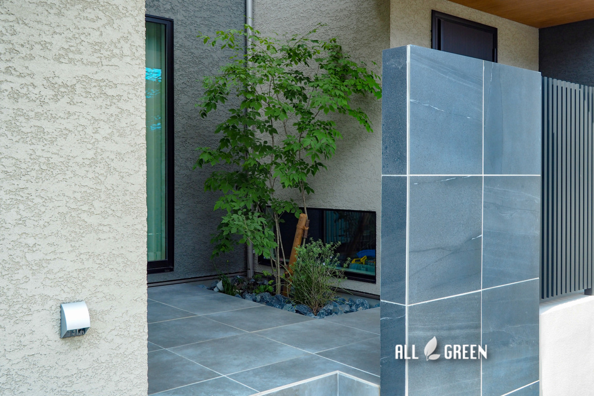 掃き出し窓前のステップと同じタイルを使用し施工された中庭のタイルポーチは、高さのある壁と縦格子でしっかり外部からの目隠しをしています。