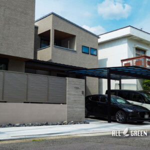 | 外構工事概要 | 名古屋市緑区T様邸新築外構 駐車場、カーポート、門塀、宅配ボックス、表札、フェンス、縦格子スクリーン、タイルポーチ、植栽 |
